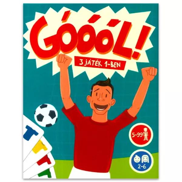 Gra z kartami Goool! pozwala dzieciom w wieku przedszkolnym i szkolnym grać w trzy rodzaje gier. W pierwszym rodzaju gry dzieci muszą pozbyć się wszystkich kart z ręki, a pierwsze dziecko, które się pozbędzie wszystkich, zostaje zwycięzcą! W drugim rodzaju gry wygrywa ten gracz, który udaje z pokerową twarzą, jaka karta jest położona obrazkiem do dołu na stosie kart! Na koniec, w trzeciej grze, dzieci mogą sprawdzić swoją szybkość! Wymiary opakowania: 12 x 10 x 2 cm.