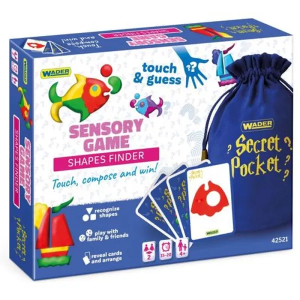 Secret Pocket to gra rozwoju sensoryczno-motorycznego dla najmłodszych. Dzieci muszą odgadnąć formy na kartach poprzez dotyk, a następnie stworzyć z nich swój obraz. To zadanie będzie miał również przeciwnik. Kto ma więcej wyobraźni i umiejętności koncentracji, może zostać zwycięzcą! Co teraz kryje się w sekretnym worku? Odwróćcie karty, znajdźcie formę i uzupełnijcie układankę. W tej grze będziecie potrzebować zarówno zmysłów, jak i wyobraźni! Pudełko zawiera 2 formy do rozwiązania: rybę i łódkę.