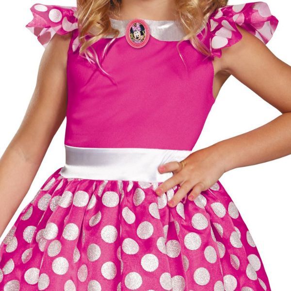 Kostium z licencją wysokiej jakości dla fanów Minnie Mouse. To idealny wybór na karnawał dla małych dzieci lub na wszelkie przebierane przyjęcia, czy zabawy w odgrywanie ról. Uroczy kostium jest ozdobiony białymi kropkami na różowym tle, ma białą kokardę w talii, szeroką spódnicę i zapinany jest z tyłu na rzep.