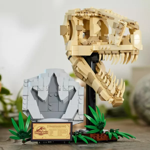 Zainspiruj dziewczęta i chłopców kochających dinozaury lub przyszłych paleontologów w wieku 9 lat i starszych zabawką z dinozaurami LEGO® Jurassic World Skamieniałości dinozaurów: czaszka T. rex (76964). Pierwszy zestaw Jurassic World stworzony do wystawiania zawiera czaszkę z otwierającą się szczęką, stojak z tabliczką informacyjną, ukrytą w tylnej części modelu figurkę „bursztynową” oraz „skamieniały” odcisk.