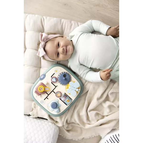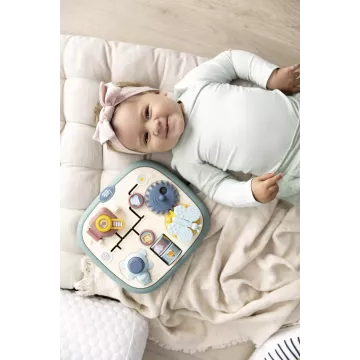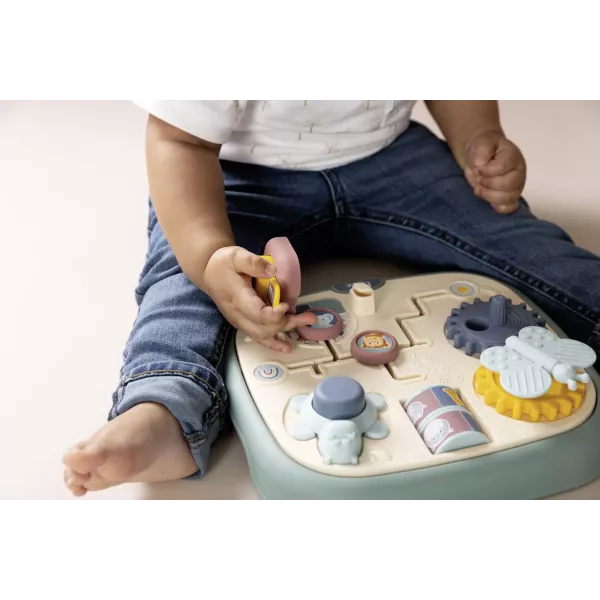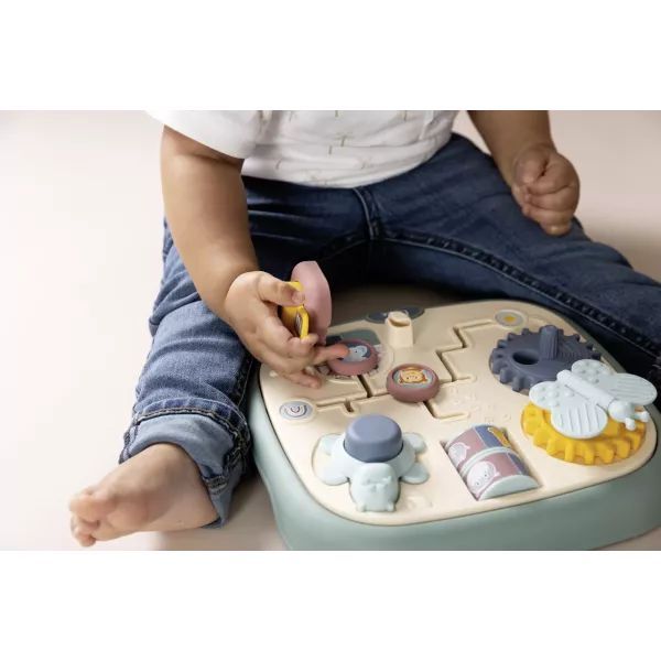 Płyta sensoryczna dostarcza dzieciom rozrywki poprzez pięć różnych aktywności: labirynt, zamykaną drzwiczkę, obracające się koła zębate, motylka oraz dwa wałki. Dodatkowo, zabawka zawiera zabawnego hipopotama, który porusza nogami po naciśnięciu jego brzucha. Zabawka nadaje się do użytkowania na podłodze, na kanapie, a także podczas podróży w samochodzie.