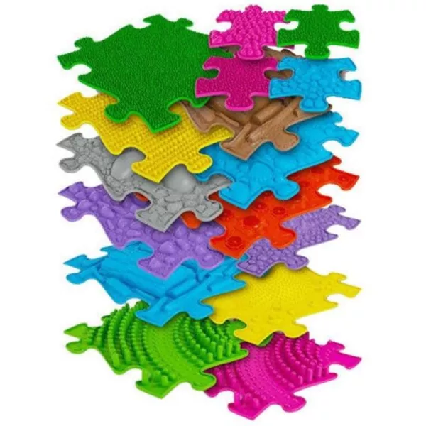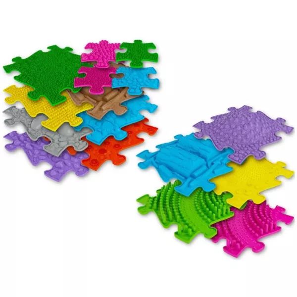 Zestaw zawiera 16 różnych kawałków maty w różnych rozmiarach i z różnymi powierzchniami (na przykład miękkie, z efektem 3D itp.).