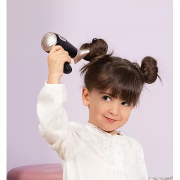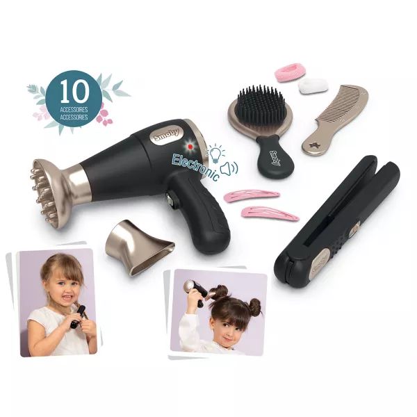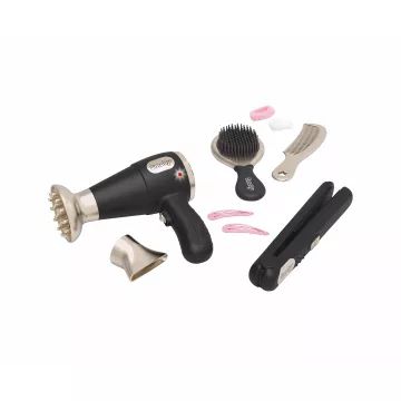 Z zestawem do zabawy w salon fryzjerski dziewczynki mogą tworzyć piękne fryzury dla siebie, swoich przyjaciół lub całej rodziny. Dziesięcioczęściowy zestaw zawiera nowoczesne i stylowe akcesoria: suszarkę do włosów z dźwiękiem i światłem z dwoma wymiennymi końcówkami, prostownicę, szczotkę do włosów, grzebień oraz spinki i gumki do włosów.