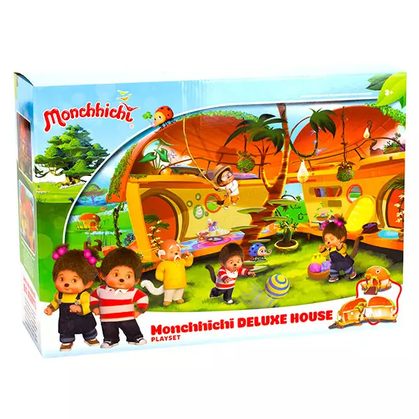 Monchhichi, postać popularna od dziesięcioleci, która pojawiła się także w opowieściach. Teraz dzieci mogą odgrywać swoje ulubione sceny lub wymyślać nowe z tym zestawem. Opakowanie zawiera luksusowy domek dwupoziomowy, który jest składany, i który jest wyposażony w taras, schody na pniu drzewa, drzwi, które można otworzyć, oraz schody wejściowe. Wymiary domku: 64 x 27 x 25 cm.